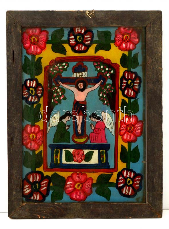 Beschreibung: Erdélyi festett üveg ikon sérült keretben, 36×25 cm