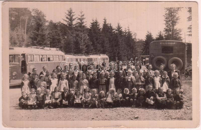 Beschreibung: cca 1949 Mátrafüred csoportkép Ikarusokkal a háttérben. Fotólap