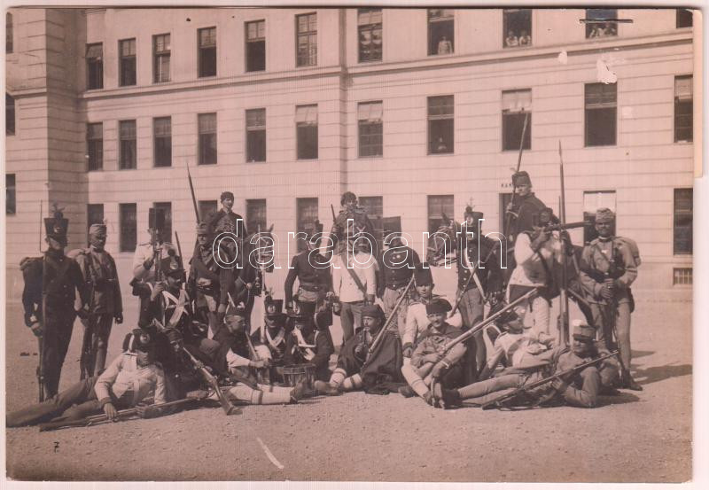 Beschreibung: 1914 A nagyváradi 16. gyalogsági ezred 375 éves fennállási ünnepsége, az ezred használt egyenruhái. Korabeli sajtófotó, hozzátűzött szöveggel 16x11 cm