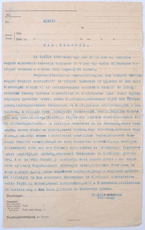 Beschreibung: 1915 Frigyes főherceg, tábornok hadiparancsként kiadott üzenete Ferenc József születésnapja alkalmából való megemlékezésre.