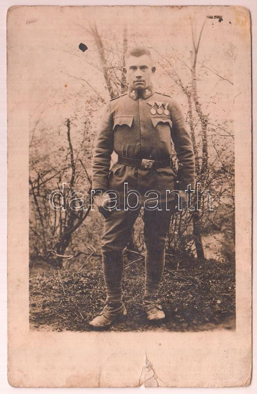 cca 1917 Katona, kitüntetésekkel, hátoldalt azonosított. Fotólap https://www.darabanth.com/de/284-Fernauktion/284.0/Andere-Sammelgebiete/Militaria~25/cca-1917-Katona-kituntetesekkel-hatoldalt-azonositott-Fotolap~II1476475