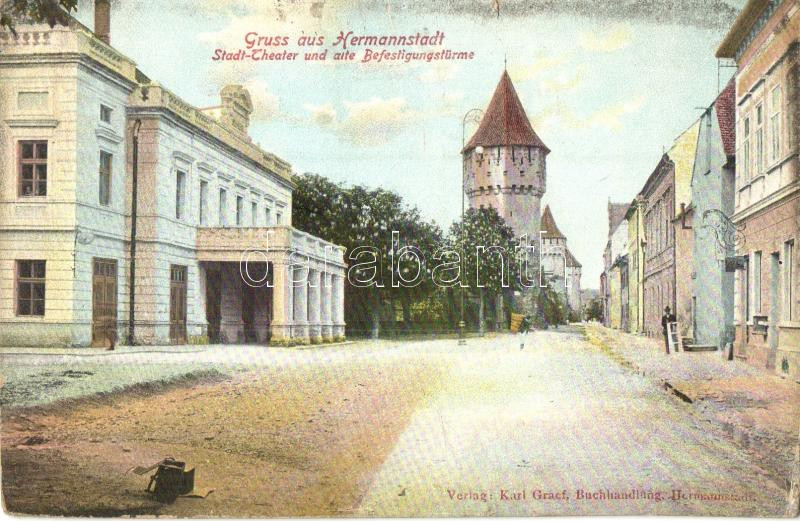 Nagyszeben, Hermannstadt, Sibiu; vártorony, Városi színház / tower, th... https://www.darabanth.com/de/284-Fernauktion/284.0/Ansichtskarten/Siebenburgen~200006/Nagyszeben-Hermannstadt-Sibiu-vartorony-Varosi-szinhaz-tower-theater-Verlag-Karl-Graef-~II1475804