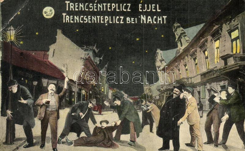 Beschreibung: Trencsénteplic, Trencianske Teplice; Trencsénteplic éjjel, humoros részeg montázs, Kral Gyula üzlete Wertheim Zsigmond kiadása / at night, humorous drunken montage, shops (EK)