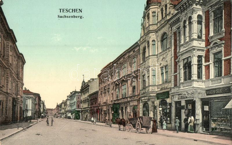 Cesky Tesin, Teschen, Sachsenberg; street, Marcus Grünefeld, B. Dittri... https://www.darabanth.com/de/284-Fernauktion/284.0/Ansichtskarten/Tschechische-Republik~200021/Cesky-Tesin-Teschen-Sachsenberg-street-Marcus-Grunefeld-B-Dittrich-Schuster-shops-EK~II1475575