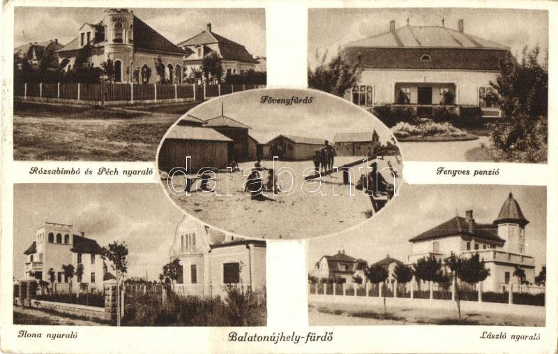 Beschreibung: Siófok, Balatonújhely; Fövenyfürdő, Rózsabimbó, Péch, Ilona, László nyaralók, Fenyves panzió (EK)