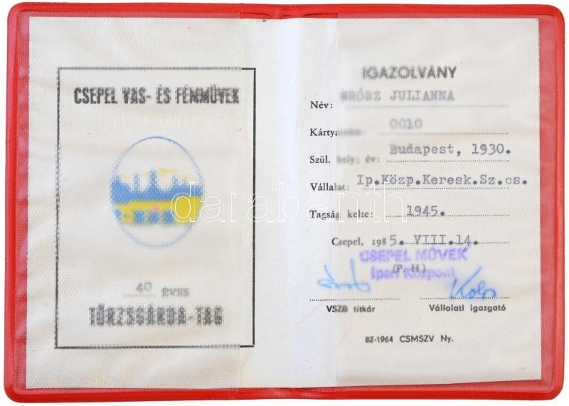 Beschreibung: 1985. "Csepel Vas- és Fémművek - 40 éve Törzsgárda tag" aranyozott, zománcozott kitűző (23x18mm) + "Csepel Vas- és Fémművek 40 éves Törzsgárda Igazolvány" Grosz Julianna nevére T:1,1-