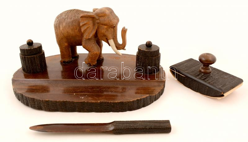 Beschreibung: cca 1940 Elefántfigurás íróasztali készlet (tintatartó porcelán betéttel, levélvágó, tapper) faragott fa, jelzés nélkül, jó állapotban, 38×25 cm