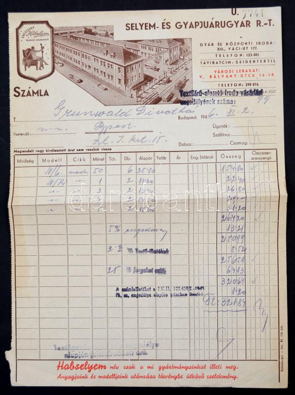 1946 Selyem és gyapjúgyár rt.. Fejléces számla. https://www.darabanth.com/de/285-Fernauktion/285.0/Andere-Sammelgebiete/Dokument~100016/1946-Selyem-es-gyapjugyar-rt-Fejleces-szamla~II1493938
