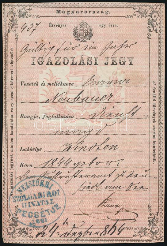 Beschreibung: Nezsider 1864 Igazolási jegy