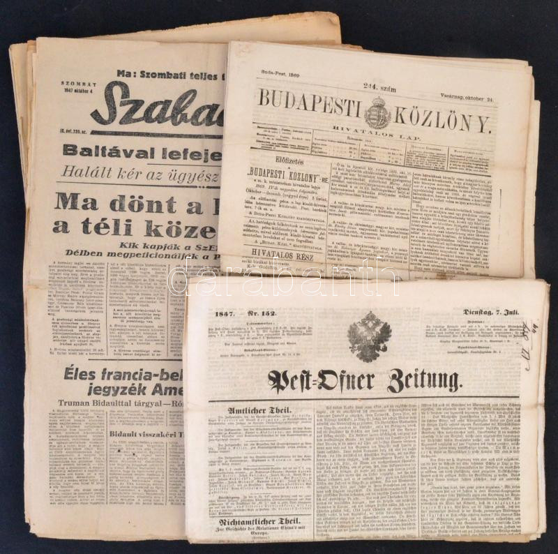 Beschreibung: 1834-1947 40 db vegyes régi újság, sok érdekes hírrel, képekkel. Budapesti Közlöny, Pest-Ofner Zeitung, Szabadság és más lapok