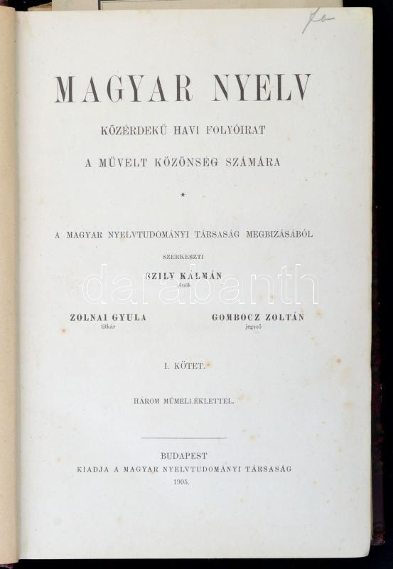 1905 Magyar nyelv. I. kötet. Közérdekű havi folyóirat a művelt közönség számára. Szerk.: Szily Kálmán, Zolnai Gyula, Gombocz Zoltán. I. évfolyam január-december, 1-10. számok, teljes évfolyam. Bp., 1905, Magyar Nyelvtudományi Társaság. Átkötött félvászon kötés. Jó állapotban.