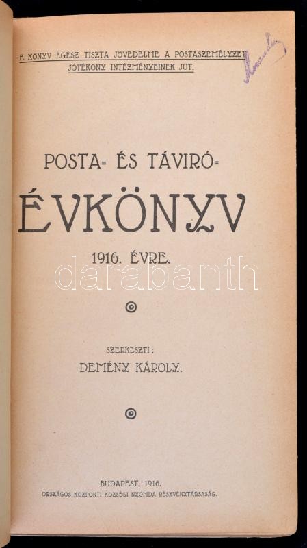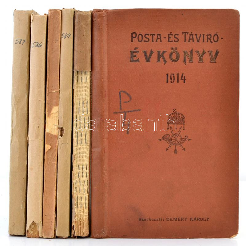 1914-1925 Posta-, és Táviró Évkönyv 6 db (1914, 1916-1918, 1924-1925), Szerk.: Demény Károly, Szalay Gábor, Peterdy Sándor. Bp., Országos Központi Községi Nyomda Rt. Kiadói egészvászon, és papír kötésben,a borítók megviselt állapotban.