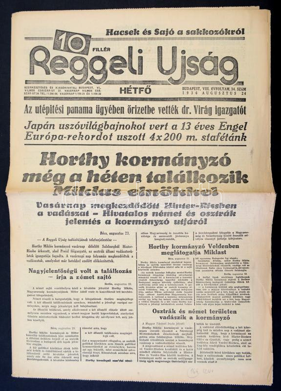 1936 A Reggeli Ujság VIII. évfolyamának 34. száma, címlapon a Horthyr... https://www.darabanth.com/de/285-Fernauktion/285.0/Andere-Sammelgebiete/Drucksachen~100027/1936-A-Reggeli-Ujsag-VIII-evfolyamanak-34-szama-cimlapon-a-Horthyrol-szolo-cikkel~II1492086