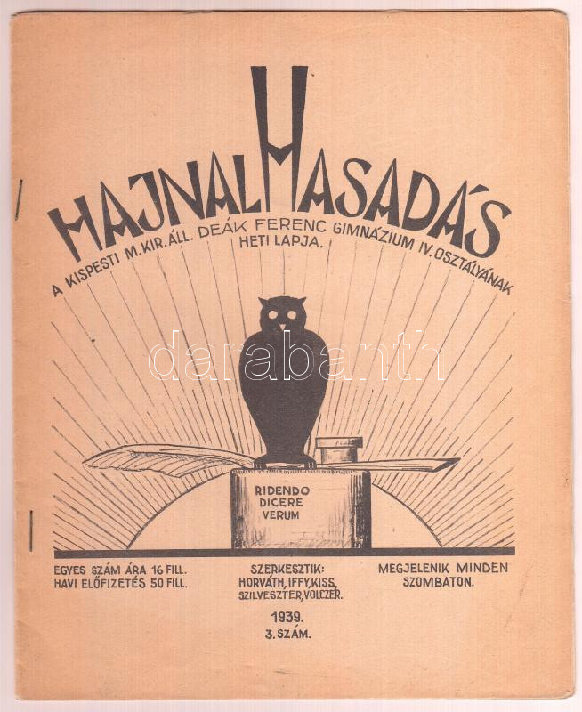 1939 Hajnalhasadás a kispesti M. Kir. Áll. Deák Ferenc Gimnázium IV. o... https://www.darabanth.com/de/285-Fernauktion/285.0/Andere-Sammelgebiete/Drucksachen~100027/1939-Hajnalhasadas-a-kispesti-M-Kir-All-Deak-Ferenc-Gimnazium-IV-osztalyanak-heti-lapja-3~II1491877