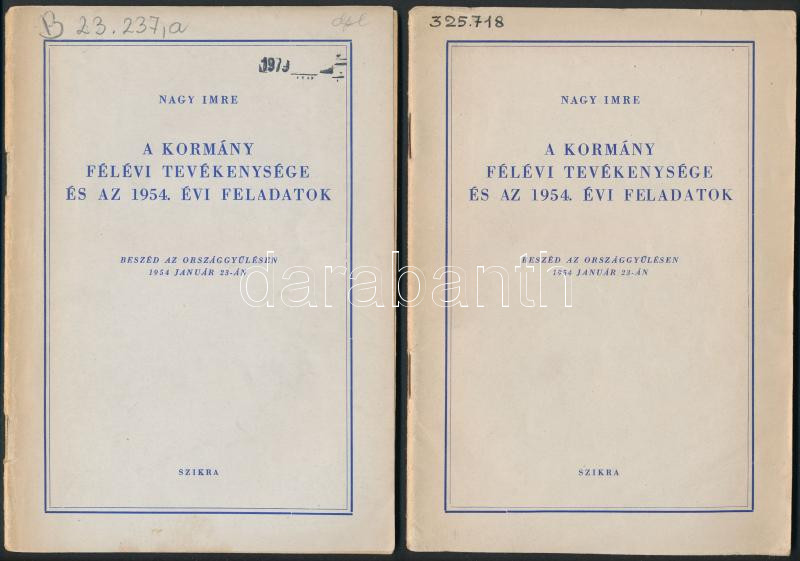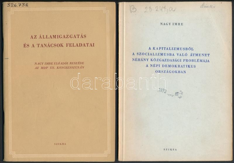 1953-1954 Négy Nagy Imre beszéd, egy-két ceruzás bejegyzéssel, intézményi bélyegzőkkel, de alapvetően jó állapotban: A Kapitalizmusból a szocializmusba való átmenet néhány közgazdasági problémája a népi demokratikus országokban. Budapest,1953, Szikra.Kiadói papírkötés. Az államigazgatás és a tanácsok feladatai. Budapest, 1954, Szikra. Kiadói papírkötés. A kormány félévi tevékenysége és az 1954. évi feladatok. Budapest, 1954, Szikra. Kiadói papírkötés. / x 2.