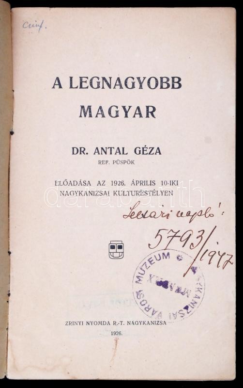 Dr. Antal Géza: A legnagyobb magyar. Nagykanizsa, 1926, Zrínyi nyomda... https://www.darabanth.com/de/285-Fernauktion/285.0/Andere-Sammelgebiete/Drucksachen~100027/Dr-Antal-Geza-A-legnagyobb-magyar-Nagykanizsa-1926-Zrinyi-nyomda-16-p-Kiadoi-papirkote~II1281782
