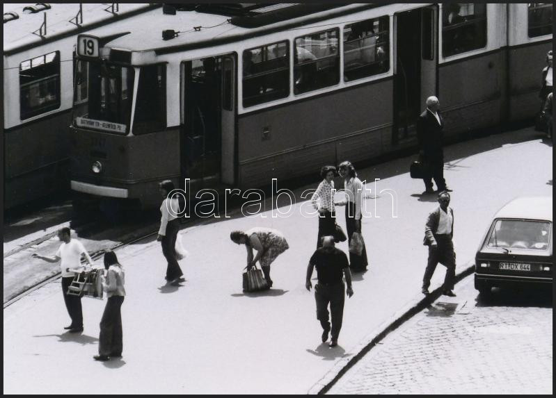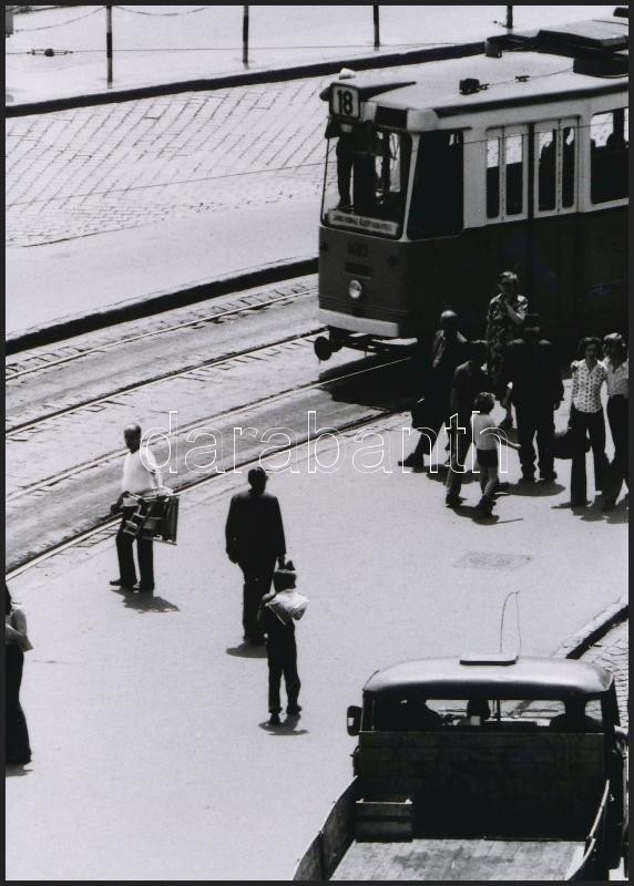 Beschreibung: cca 1977 Budapest, Gellért tér, a 18-as és 19-es villamos közös megállójában, 2 db korabeli vintage negatívról készült mai nagyítás, 13x18 cm