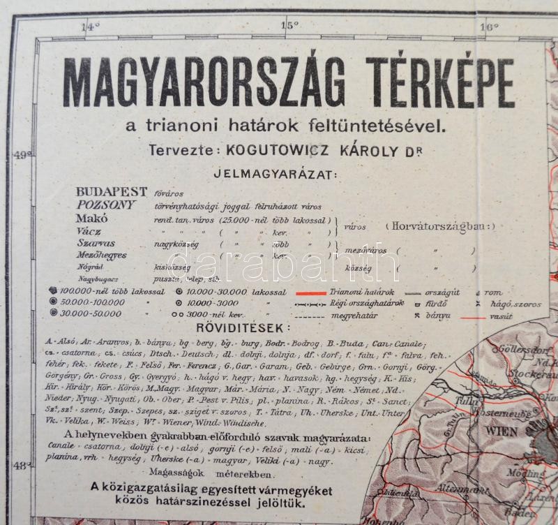 cca 1920-1930 Magyarország térképe, a trianoni határok feltüntetésével, tervezete Kogutowitcz Károly, Magyar Földrajzi Intézet Rt., a hajtások mentén szakadásokkal, 59x72 cm.