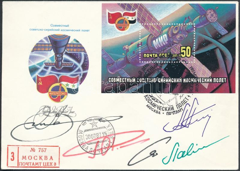 Jurij Viktorovics Romanyenko (1944- ), Alekszandr Lavejkin (1951- ), Alekszandr Viktorenko (1947- ) szovjet, Alekszandr Alekszandrov (1951- ) bolgár és Muhammad Faris (1951- ) szír űrhajósok aláírásai emlékborítékon /