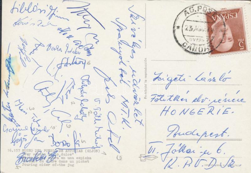 Beschreibung: cca 1974 MTK-s labdarúgók (V. Tóth, Tulipán, Bicskei, Borsó, stb.) aláírásai Spanyolországból küldött levelezőlapon