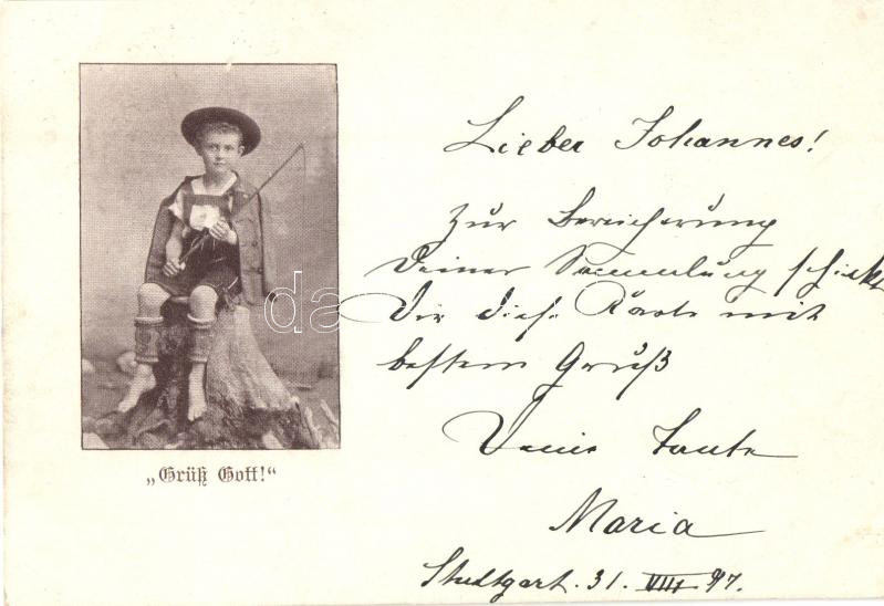1897 (Vorläufer!) 'Grüß Gott!' / Greeting card with boy hold... https://www.darabanth.com/de/285-Fernauktion/285.0/Ansichtskarten/GruC39Fkarten-Feste~200086/1897-Vorlaufer-GruC39F-Gott-Greeting-card-with-boy-holding-a-fishing-rod-EK~II1485142