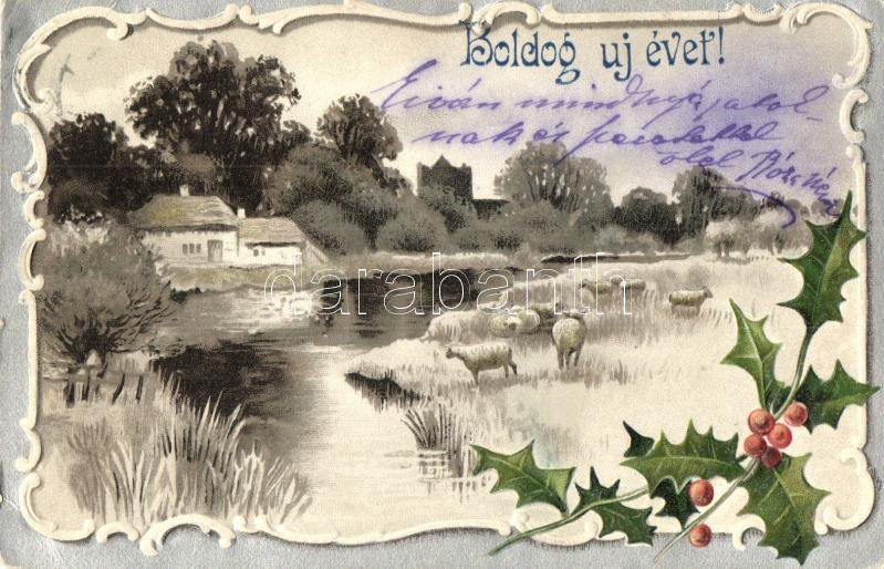'Boldog Új Évet!' / New Year's greeting card, metallic ... https://www.darabanth.com/de/285-Fernauktion/285.0/Ansichtskarten/GruC39Fkarten-Feste~200086/Boldog-Uj-Evet-New-Years-greeting-card-metallic-decorated-Emb-Erika-Nr-3719-3-Dessin-~II1489310