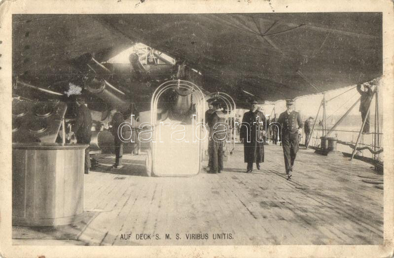 'Auf Deck SMS Viribus Unitis' / A Viribus Unitis fedélzetén, K.u.K. hadintengerészek, lövegek / K.u.K. Kriegsmarine, mariners, navy, on board, cannons, phot. A. Beer., Verlag F. W. Schrinner, Pola; marinefeldpost from SMS Bellona (Rb)