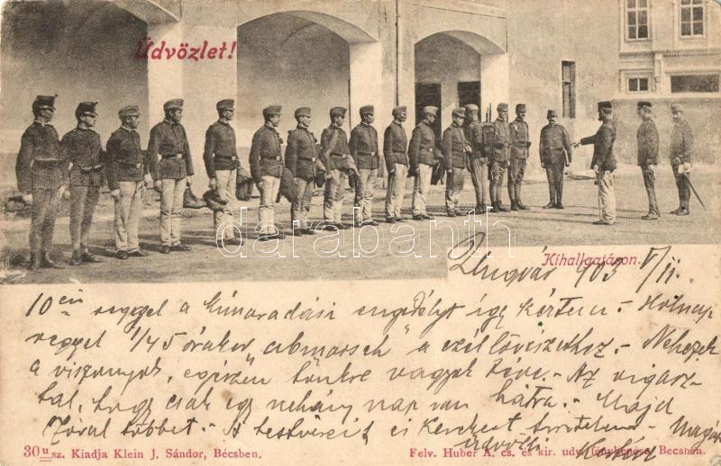 Beschreibung: 'Kihallgatáson' / WWI K.u.K. soldiers standing in line for questioning, Huber A. felvétele, Klein J. Sándor kiadása (EK)