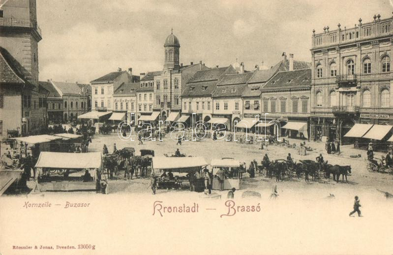 Beschreibung: Brassó, Kronstadt, Brasov; Búzasor, Servatius & Graef üzlete, gyógyszertár, kaidja Römmler & Jonas / wheat market, shop, pharmacy (EK)