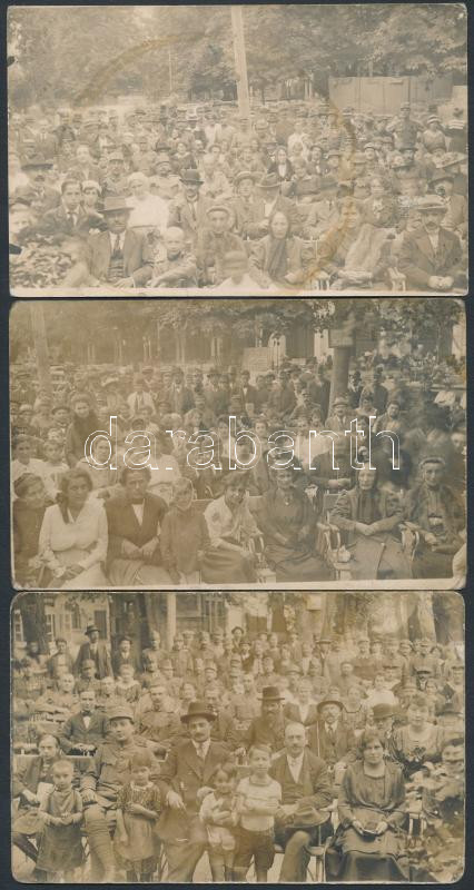 1918 Pöstyén, Piestany - 3 db RÉGI fotó képeslap a pöstyéni Kerti Ünnepről (Gartenfest), katonák és civilek, csoportképek / 3 pre-1945 photo postcards, garden festival, soldiers and civilians, group photo
