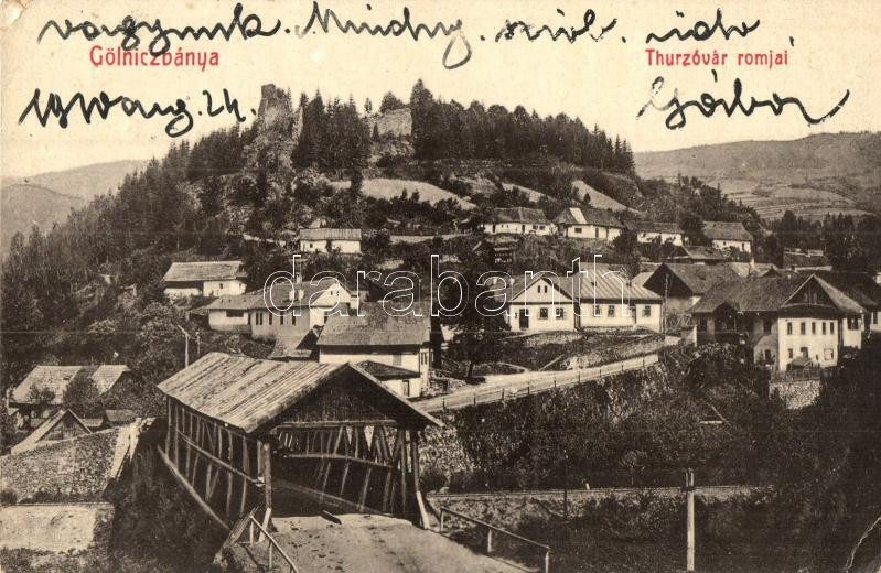 Beschreibung: Gölnicbánya, Gelnica, Göllnitz; Thurzóvár romok, híd, W. L. Bp. 2704-706. / castle ruins, bridge (EK)