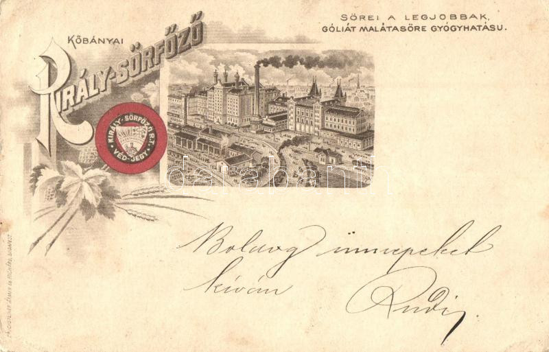 1898 Budapest X. Kőbánya, Király-sörfőzde, címer, reklám, Bruchsteiner... https://www.darabanth.com/de/285-Fernauktion/285.0/Ansichtskarten/Ungarn~200005/1898-Budapest-X-Kobanya-Kiraly-sorfozde-cimer-reklam-Bruchsteiner-Armin-es-Richard-ki~II1488671
