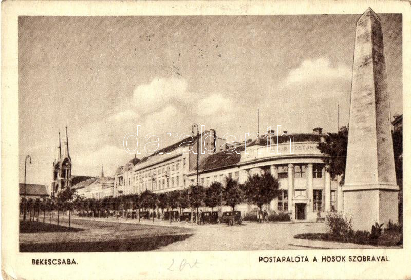 Békéscsaba, Postapalota a Hősök szobrával, automobilok (EK) https://www.darabanth.com/de/285-Fernauktion/285.0/Ansichtskarten/Ungarn~200005/Bekescsaba-Postapalota-a-Hosok-szobraval-automobilok-EK~II1487762