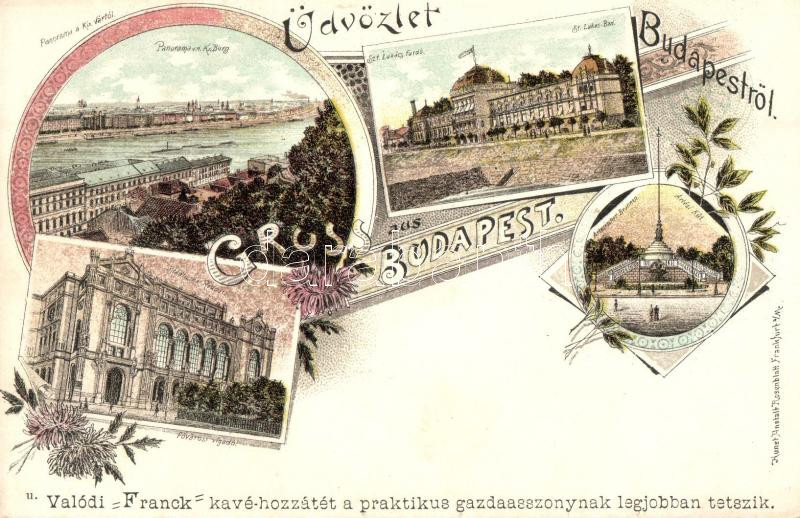 Beschreibung: Budapest, Fővárosi vigadó, Artézi kút, Szent Lukács fürdő, kiadja Rigler József Ede, Art Nouveau, Rosenblatt litho