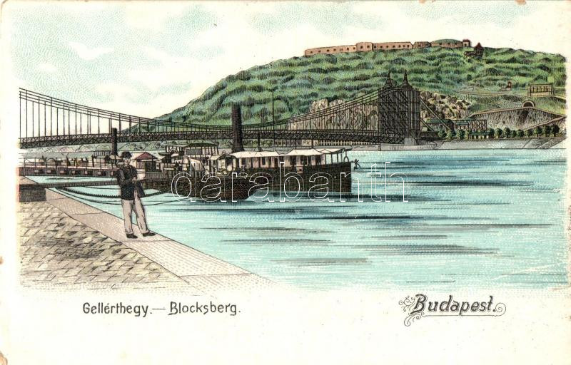 Beschreibung: Budapest I. Gellérthegy, épülő Erzsébet híd, gőzhajó, litho (kis szakadás / small tear)