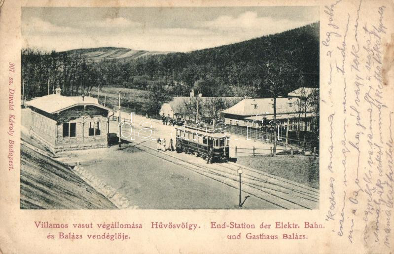 Beschreibung: Budapest II. Hűvösvölgy, Villamos vasúti végállomás Balázs-féle vendéglővel. Divald Károly 307. (EK)