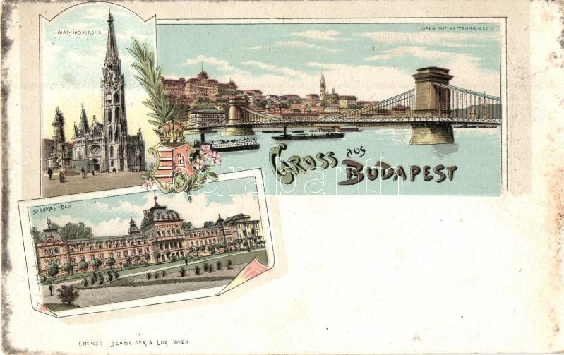 Budapest, Lánchíd, Mátyás templom, Lukács fürdő, Scneider & Lux No... https://www.darabanth.com/de/285-Fernauktion/285.0/Ansichtskarten/Ungarn~200005/Budapest-Lanchid-Matyas-templom-Lukacs-furdo-Scneider-Lux-No-103-litho-fl~II1484999