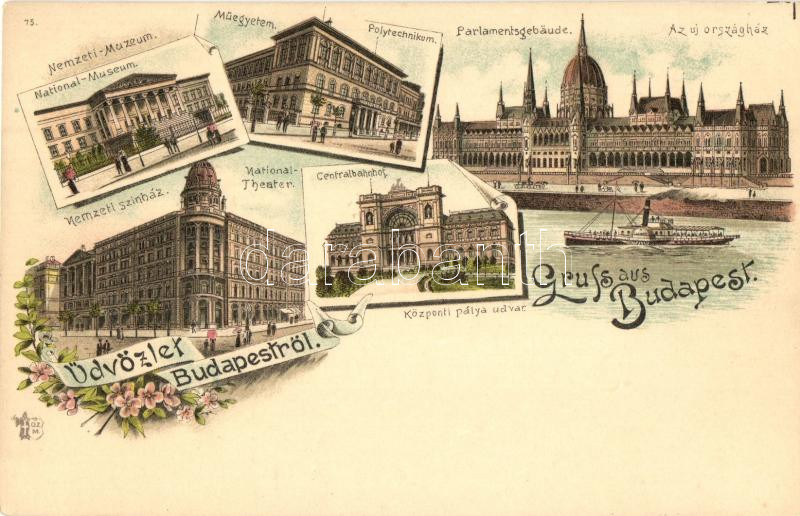 Beschreibung: Budapest, Nemzeti Múzeum és Színház, Műegyetem, Országház, Központi (Keleti) pályaudvar, Ottmar Zieher floral Art Nouveau litho