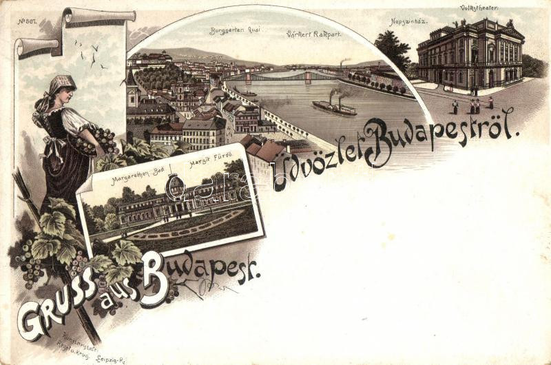 Beschreibung: Budapest, Népszínház, Várkert rakpart, Margit fürdő, floral, Regel u. Krug litho (EK)