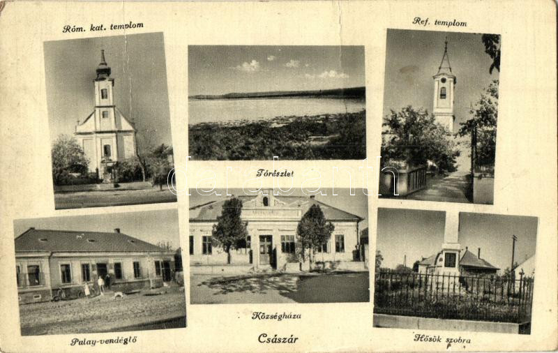 Beschreibung: Császár, római katolikus és református templomok, tórészlet, Pulay-vendéglő, községháza, Hősök szobra (fa)