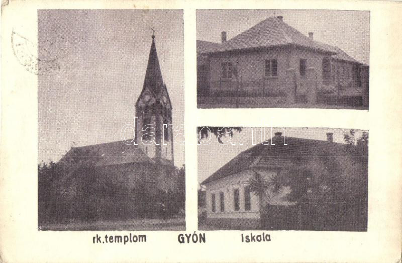Beschreibung: Gyón, római katolikus templom, iskola, Szokoly János kiadása (EK)