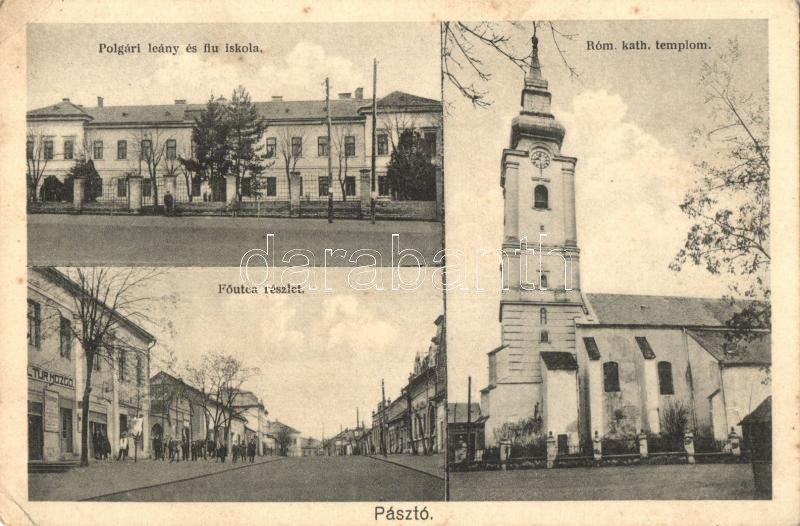 Beschreibung: Pásztó, Polgári leány és fiú iskola, Főutca, mozi, Győry Dezső üzlete, római katolikus templom, kiadja Tury István (EK)