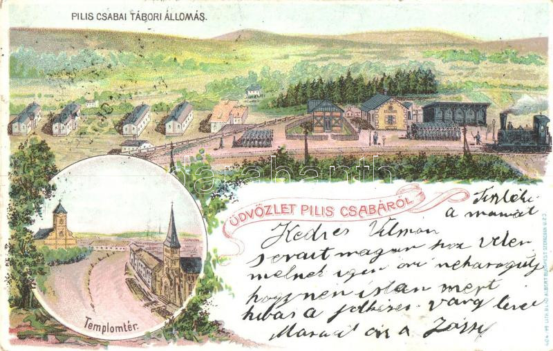 Beschreibung: Piliscsaba, Tábori állomás, vasútállomás, gőzmozdony, katonák, templomtér, Art Nouveau, Blau Albert litho (kis szakadás / small tear)