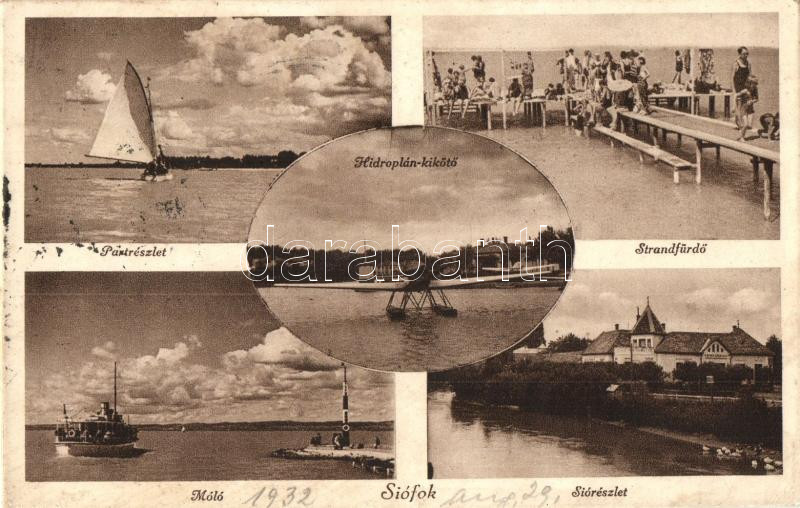 Siófok, Hidroplán kikötő, strandfürdő, móló (ázott / wet damage) https://www.darabanth.com/de/285-Fernauktion/285.0/Ansichtskarten/Ungarn~200005/Siofok-Hidroplan-kikoto-strandfurdo-molo-azott-wet-damage~II1490846