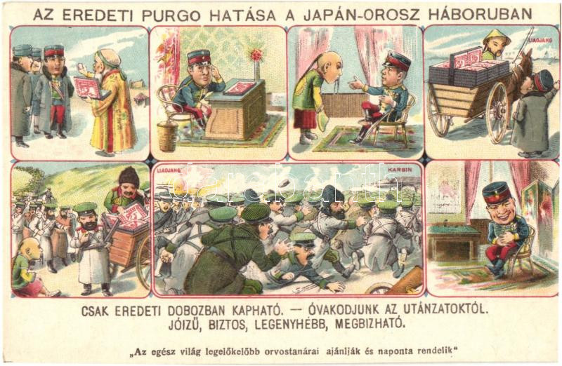 Beschreibung: Az eredeti Purgo hatása a Japán-Orosz háborúban, humoros grafikai reklámlap / Purgo laxative advertisement, humorous graphic art posctard, Russo-Japanese war, litho