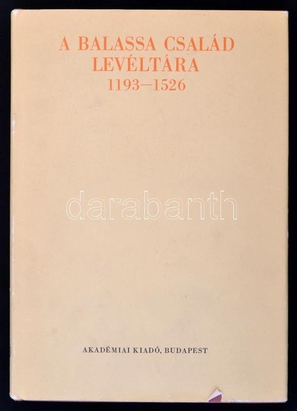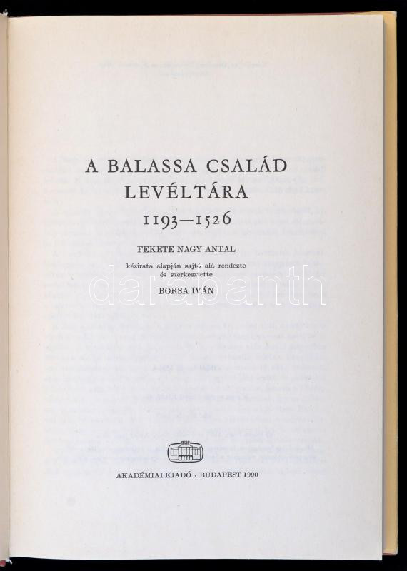 Fekete Nagy Antal, Borsa Iván: A Balassa Család Levéltára 1193-1526. Magyar Országos Levéltár Kiadványai II. Forráskiadványok 18. Bp., 1990, Akadémiai Kiadó. Kiadói egészvászon kötés, kiadói papírborítóban. Jó állapotban.