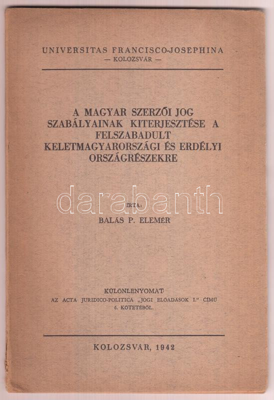 Balás P. Elemér: A magyar szerzői jog szabályainak kiterjesztése a felszabadult kelet-magyarországi és erdélyi országrészekre, különlenyomat az Acta Juridico-Politica "Jogi előadások I." című 6. kötetéből. Kolozsvár, 1942, Universitas Francisco-Josephina. Kiadói papírkötés, kissé kopottas állapotban.