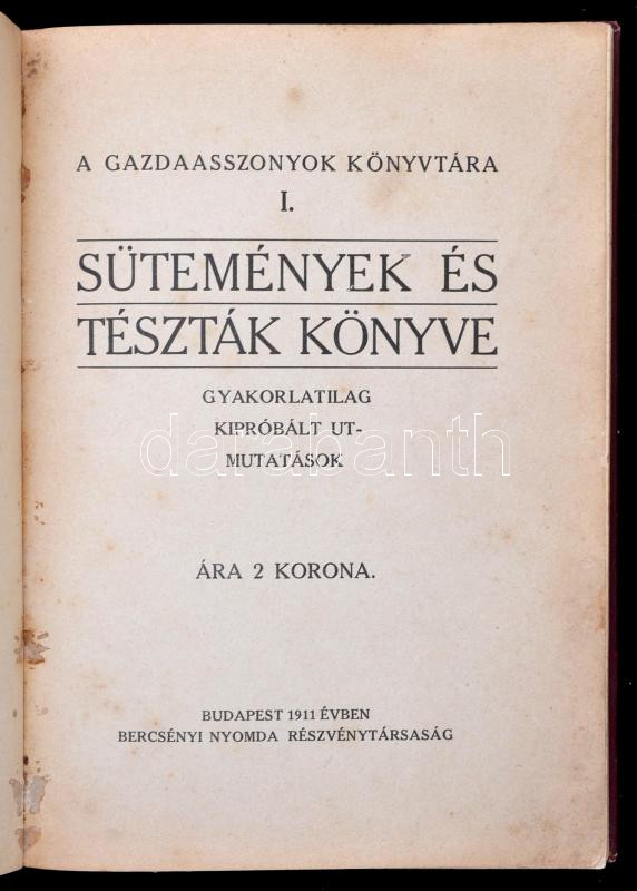 Sütemények és tészták könyve. Gazdaasszonyok könyvtára I. Gyakorlatilag kipróbált útmutatások. Bp., 1911, Bercsényi Nyomda. Egészvászon kötés, szakadt lapok, kézzel írt receptek, kissé kopott állapotban.