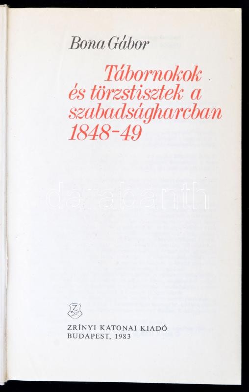 Bona Gábor: Tábornokok és törzstisztek a szabadságharcban 1848-49. Budapest, 1983, Zrínyi Katonai kiadó. Kiadói egészvászon kötés, kiadói papír védőborítóval. Jó állapotban.