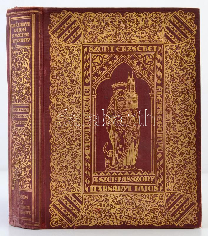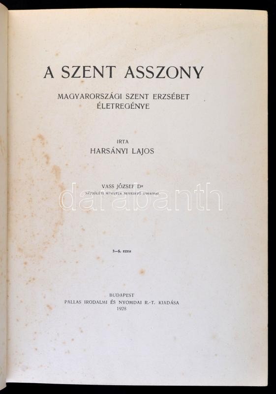 Harsányi Lajos: A szent asszony. Magyarországi Szent Erzsébet életregénye. Dr. Vass József népjóléti miniszter bevezető soraival. Bp., 1928, Pallas Irodalmi és Nyomdai Rt., 238 p.+10 t. (4 színes, 6 fekete-fehér, 1 kétoldalas) Kiadói dúsan aranyozott, vaknyomásos egészvászon kötésben, kissé kopottas borítóval, gerinccel,némileg foltos címoldallal, szövegközti képekkel.